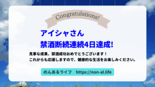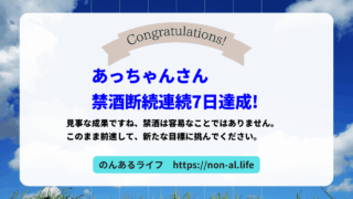 禁酒成功おめでとう、あっちゃんさん! 本記事は「のんあるライフ」会員の禁酒断酒の記録です。 禁酒成功コメント ノンアルビールにも慣れてきた。夕飯後にすぐ片付けてお皿洗いをするようになって、時間が増えた。家族としらふで話す時間が増えてきた。嬉...