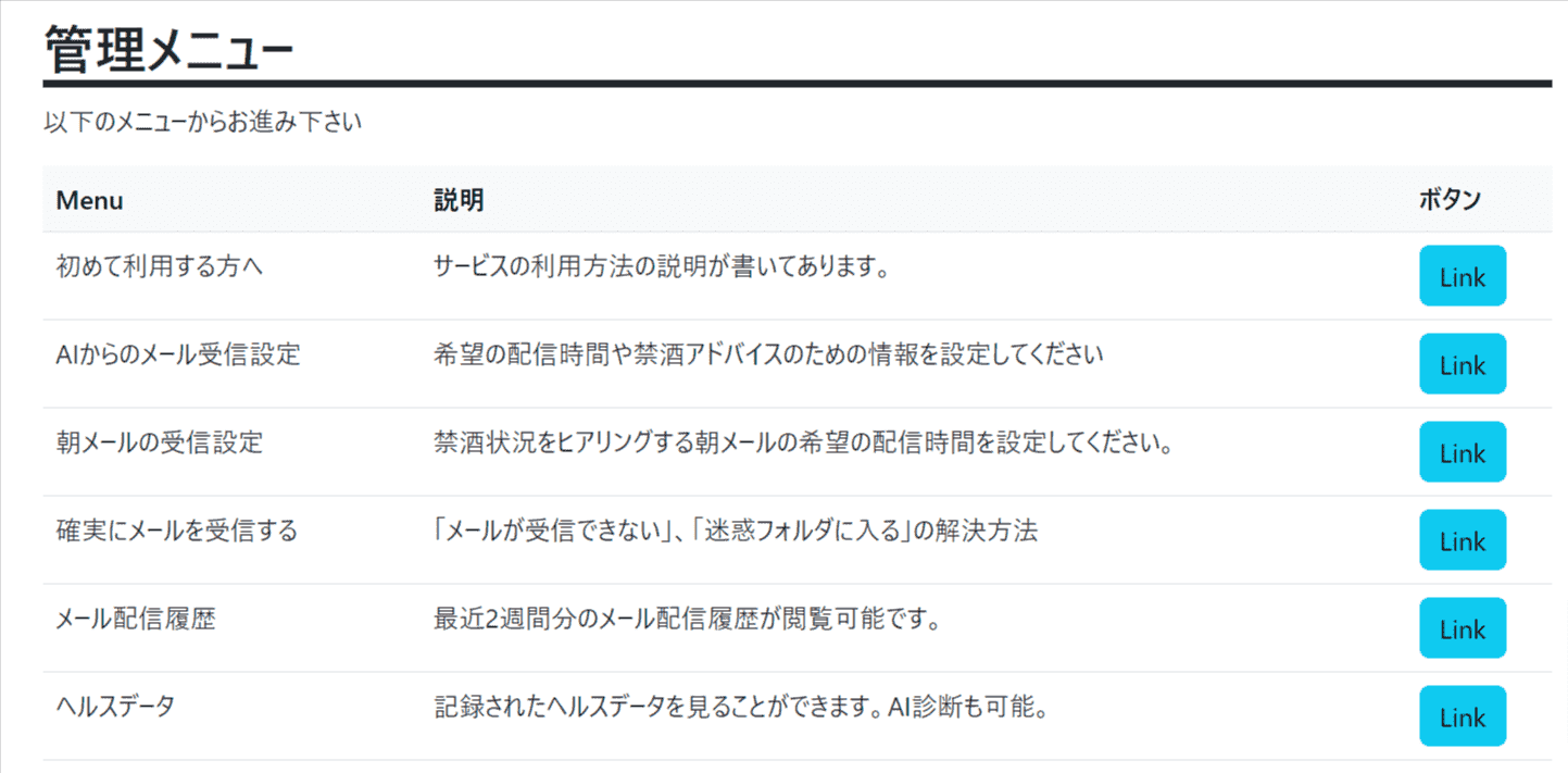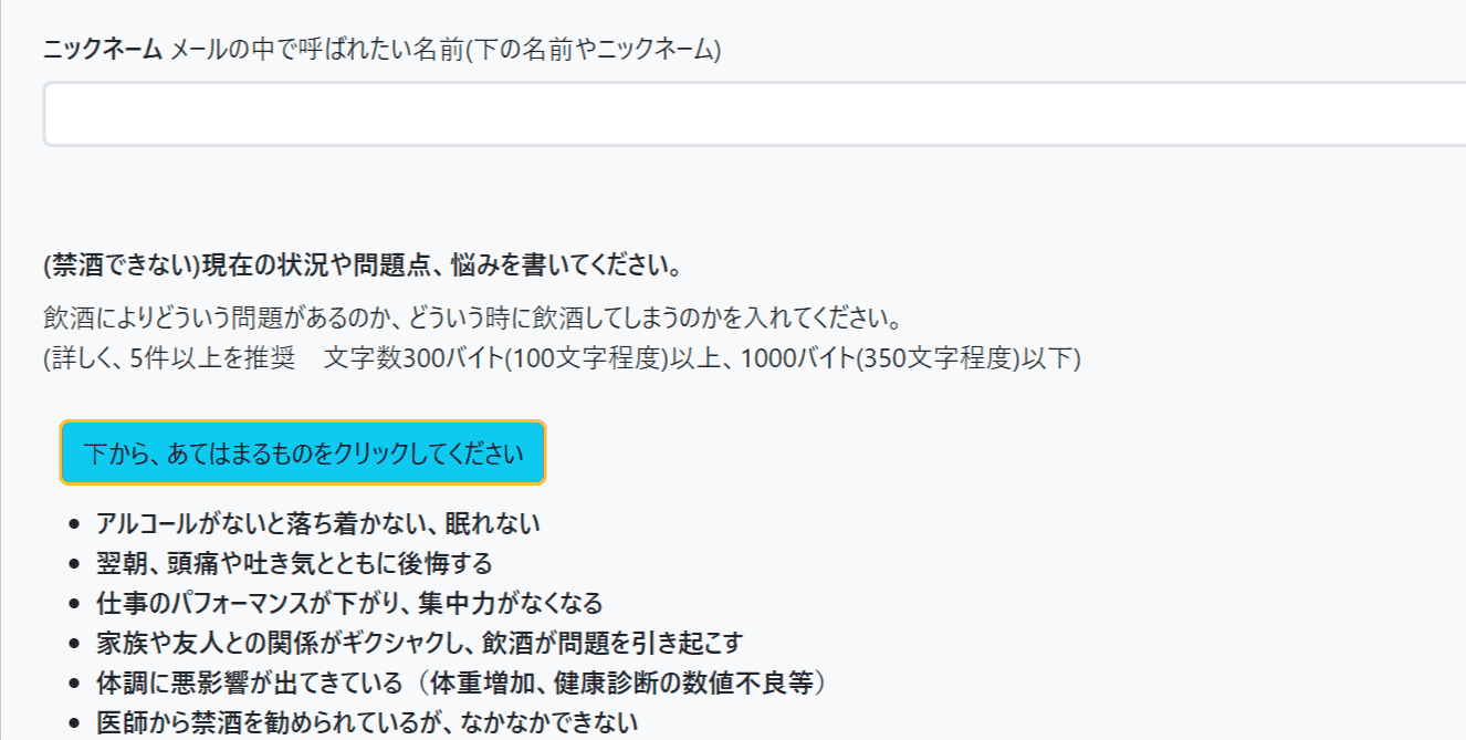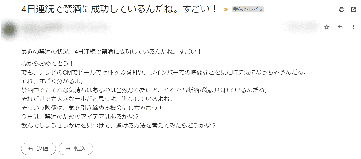 あなたの飲酒習慣や理想などを踏まえて、サポーター(人)とAIが協同して、禁酒を促す日々異なるメールを届けます。