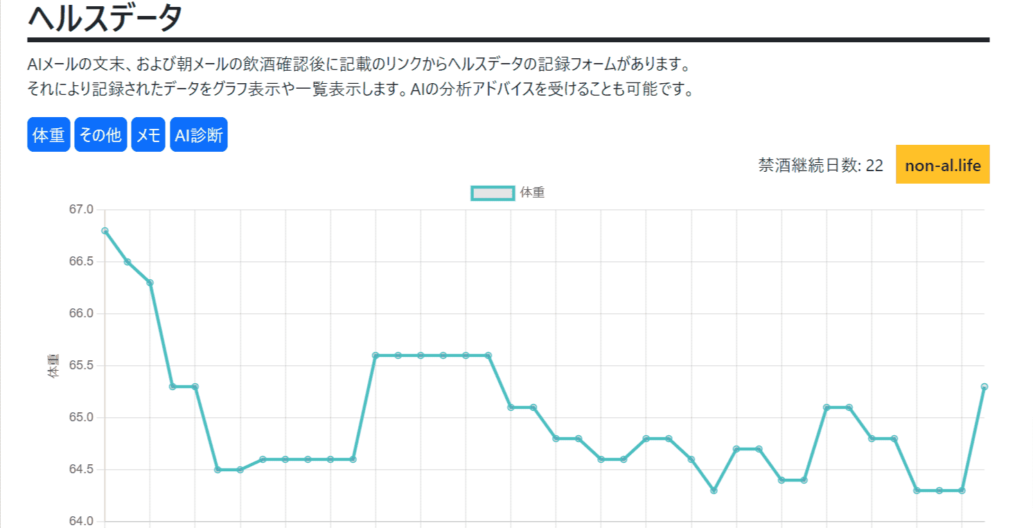 体重グラフ 健康複数要素グラフ AI分析ログイン後のページでは、禁酒の連続日数や禁酒率を表示します。また、メールでも禁酒継続日数を表示しますので、励みになります。