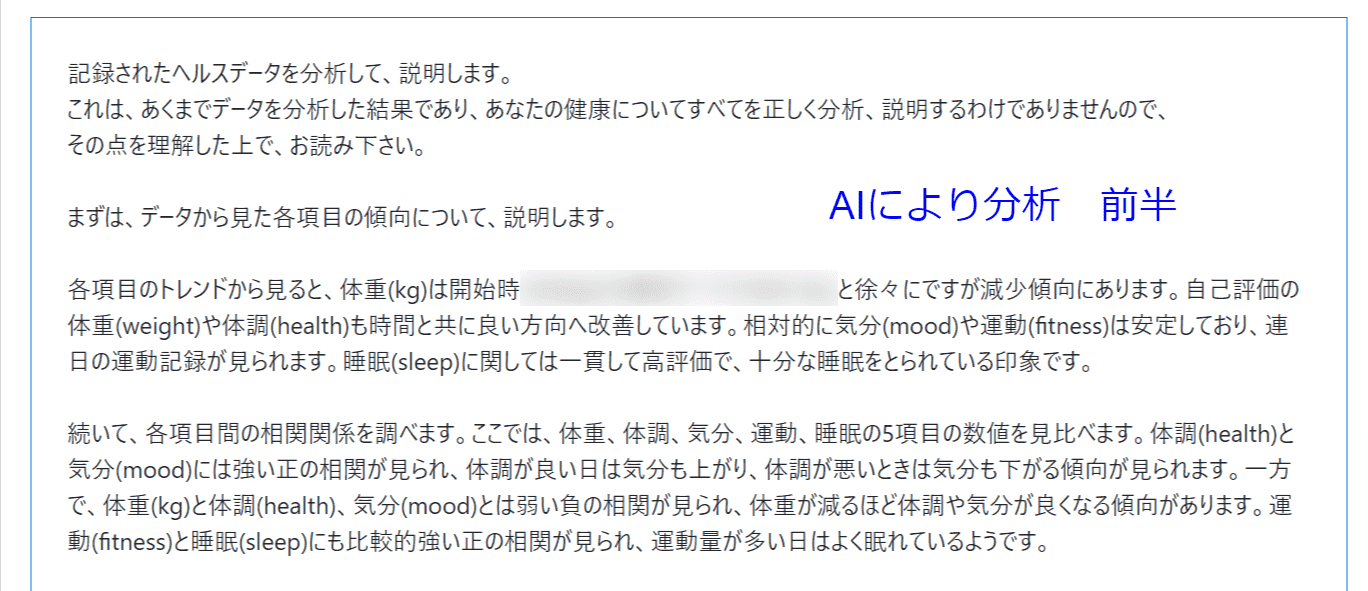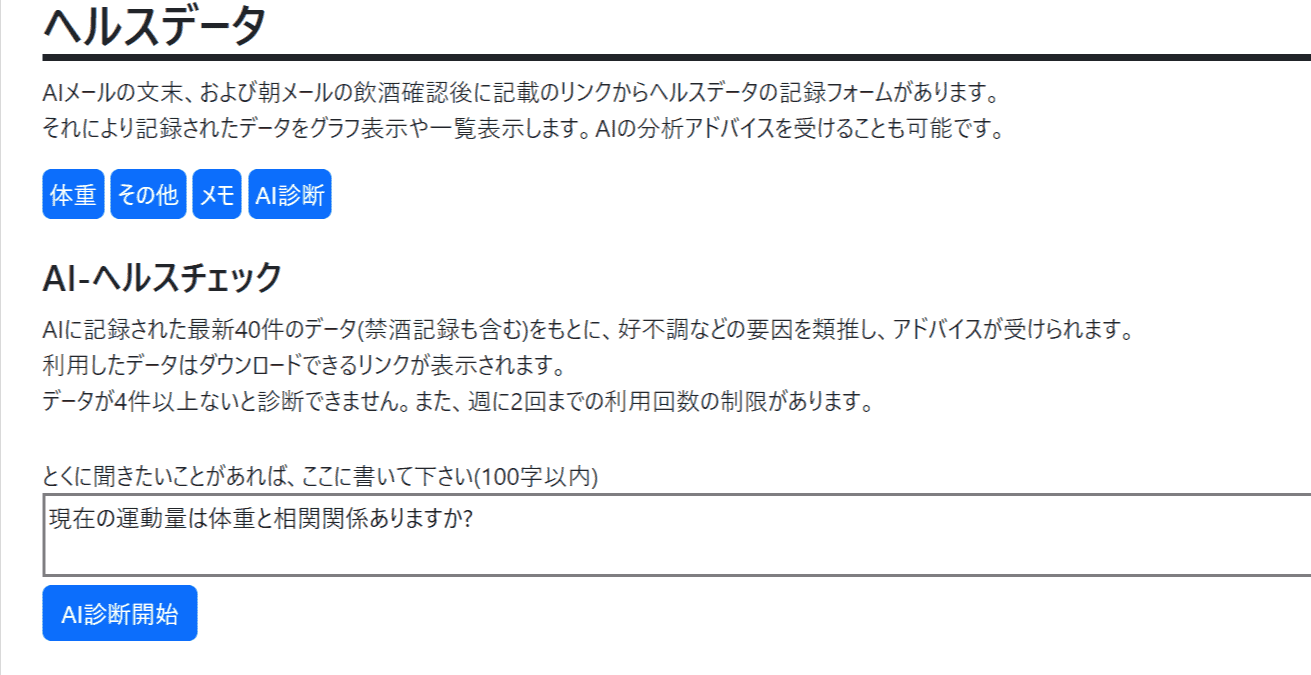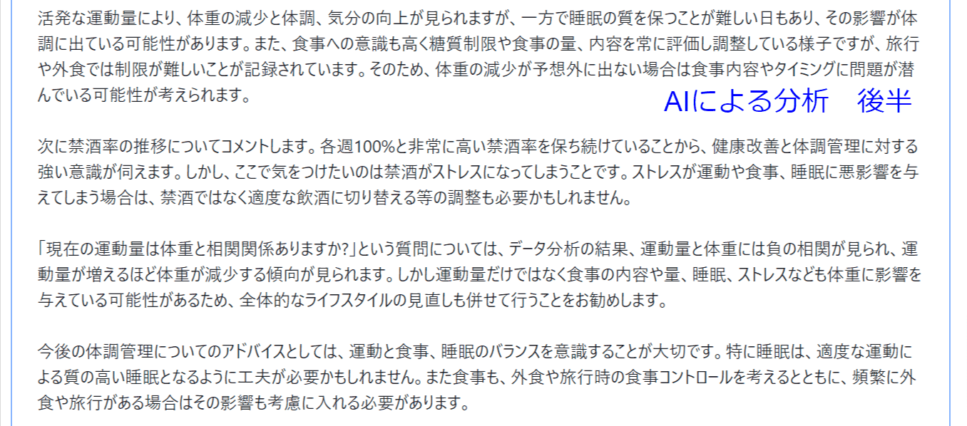 禁酒が継続できるようになると、志向が禁酒から「健康」と向かうことが多いです。健康志向をするようになり、「禁酒」「減酒」が段々と普通のことになってきます。体重、体調などの複数の項目と日々のメモからAIがデータ分析し、健康全体について、アドバイスをします。